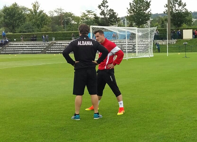 Kombëtarja shqiptare e futbollit ka zhvilluar stërvitjen e parë përpara ndeshjes kundër Rumanisë. Për shkat të shiut, të dyja stërvitjet si e jona ashtu edhe e kundërshtarëve janë anuluar për tu zhvilluar në stadiumin e Lionit. Kombëtarja në orën 18.15 ka zbritur për tu stërvitur në kompleksin sportiv të klubit vendas. Vetëm Naser Aliji, i cili ka ndjerë mbrëmë dhimbje në kofshën e djathtë ka bërë stërvitje të diferencuar. Pjesa e parë e stërvitjes ka qenë nxemje nëpërmjet lojrave dhe kuadrateve të ndryshme. Pastaj përgatitësi atletik ka zhvilluar ushtrime të ndryshme aerobike dhe sprinte të ndryshme. Pas gjysmës orës së parë, ekipi ka nisur pjesën më të rëndësishme, atë taktike. Pas 70 minutave skuadra, është rikthyer në hotel “Golden Tulipe” i cili për dy ditë do të jeë rezidencë e skudrës tonë kombëtare.